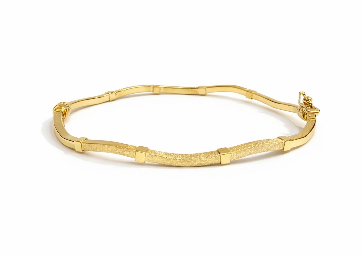 Dieser hochwertige Armreif aus echtem 585 / 14K Gold überzeugt durch sein elegantes und modernes Design. Der Armreif ist angenehm leicht mit 4 Gramm Gewicht und bietet hohen Tragekomfort. Dank des praktischen Klappverschlusses lässt sich der Armreif sicher und bequem tragen.